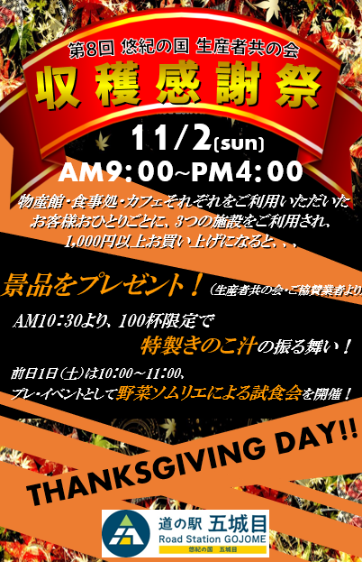11/2(sun) AM9:00~PM4:00 物産館・食事処・カフェそれぞれをご利用いただいたお客様おひとりごとに、3つの施設をご利用され、1,000円以上お買い上げになると、景品をプレゼント!(生産者共の会・ご協賛業者より) AM10:30より100杯限定で特製きのこ汁の振る舞い! 前日1日(土)は10:00~11:00、 プレ・イベントとして野菜ソムリエによる試食会を開催! 皆様のご来館を心よりお待ちしております!