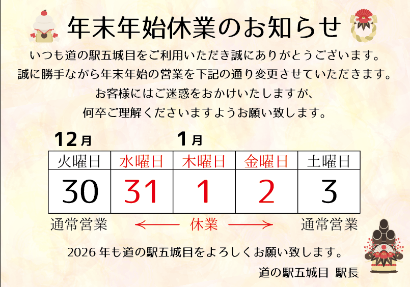 今年も道の駅五城目をご利用いただき誠に ありがとうございます。 誠に勝手ながら、 12月31日(水)から1月2日(金)まで休業 とさせていただきます。 お客様には大変ご迷惑をおかけいたしますが、 ご了承くださいますようお願い申し上げます。 尚、道の駅側24時間トイレはご利用できますので お立ち寄りください。 2026年も道の駅五城目を どうぞよろしくお願い致します。